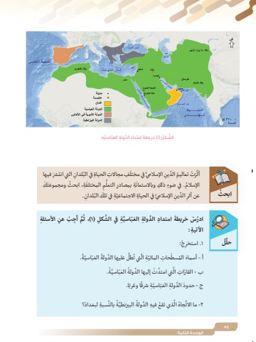 54ُ الوحدة ُ الثانيةْ ابحثِ َ التي انتشر فيها ُلدانَ ِف ِ مجاالت ِ الحياة في البِ اإلسالميِّ في مختلَر ْت ُ تعاليم ِّ الدينَّأثََكِة ْ ، ابحث ومجموعتَِ المختلفمُِّ التعلِة بمصادرَ ذلك وباالستعانُ اإلسالم ِ . في ضوء ِِ.ُلدانَّ ِة في تلكَ البِ اإلسالميِّ ِ في الحياة االجتماعيِ ِّ الدينعن أثرَّ ِة.ّاسي الد ِ ولة العبَّ الش ُكل )١ ) ُ خريطة ِ امتداد َّْلِّحل األسئلةِ ِِج ْب عنَم أَُِّ )1 ،)ثكلََّّ اسيِة في الش امتداد َّ الد ِ ولة َ الع ّبَ ُِ ادر ْس خريطةِ اآلتية: ْج:ِ1 .استخر.َُّةُ َ العّباسيُّ َّ عليها الدولةُطلَّتي تَّ ِة الّ ِ حات المائيَ أ - أسماء ُ المسط.َُّةُ َ العّباسيَّ َّ تي امتد ْت َّ إليها الدولةّ ب - القار ِ ات الًا.ًا وغربَّ ِة شرقَ ج - حدود َّ الد ِولة َ العّباسيِّ ِسبة َ لبغداد؟ُ بالنَّةُ البيزنطيَّ ُ ذي تقع ِ فيه َّ الدولةُ الِّجاه٢ -ما االت