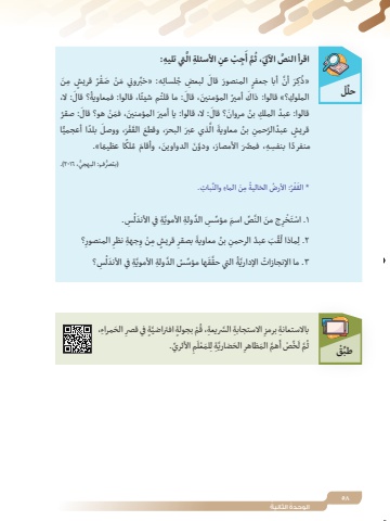 58ُ الوحدة ُ الثانيةْلِّحلَّ ِ تي تليه: األسئلة الِ ِِ ْب عنجَم أََُّّ اقرأ النص َ اآلتي، ث م َن قريش ِْ ُر ٍِّ َ روني م ْن َ صقِه: »خبَ ِ لبعض ُ جلسائٍ َ المنصور قالِك َر َّ أن أبا جعفرُ»ذَ: ال، ُ؟ قالًا، قالوا: فمعاويةُم شيئَ: ما قلتَ ُ أمير َ المؤمنين، قالِ الملوك؟« قالوا: ذاكَ ُ : صقرَ َ : ال، قالوا: يا أمير َ المؤمنين َ ، فم ْن هو؟ قالُ قالوا: عبد ِ الملك ُ بن َ مروان؟ قالَ ً بلد ًّ ا أعجميا ْ َر، ووصلَفَّ َ ذي عبر َ البحر َ ، وقطع القَ الِ ُ بن معاويةقريش ُ عبد َّ الرحمنًٍ ً ا عظيما«.ً منفرد ِ ا بنفس ِه َّ ، فمصَر َ األمصار َّ ، ودو َن َ الدواوين َ ، وأقام ُ ملك) ُّ بتصر ُّ فٍ: البهجي، ٢01٦.)َّ ِ بات. الماء والن م َن ُِ ِْ ُر ُ : األرض الخاليةَف* القِس.َُّ ِة َ في األندلَّ ِّص َ اسم ِّ مؤس ِس َّ الد ِولة األمويِ َ ج من النْرَخ1 . ْ استِ؟ِ المنصورِ ِ جهة نظر م ْن و قريش ِِ ٍَ بصقرِ ُ بن معاويةِّ َب ُ عبد الرحمنقُِماذا ل٢ .لِس؟َُّ ِة َ في األندلَ ِّ ها مؤس ُس َّ الد ِولة األمويَّقُ التي حقَّة٣ . ُ ما اإلنجازات اإلداريِّ ْقطبِ َ الح ِ مراء، َّ ٍة في قصرُ ْم ٍ بجولة افتراضيِ ِ االستجابة َّ الس ِ ريعة، قِ باالستعانة برمزِ ِّ األثري.َمِ َ لم ْعلَّ ِة لِ َ الحضاريَ َّهم َ المظاهرِّ ْص أَخَّم لُث