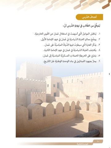 60ُ الوحدة ُ الثانيةرسُ َّ الد ِ أهدافِ َّ الد ِرس ْ أن:الب في نهايةّ َِّ ُع من الطُتوقيَّ ِة.ُوى الخارجيِ القُ َ مان عنَّ َ تي أسهم ْت ِ في استقالل عَ الُ َ ناقش ِ العوامل1 .يُولى.ُ َ مان ِ في عهد ِ اإلمامة األَّ ِة في ع٢ ِّ .يوض َح َ معالم َ الح ِ ياة ِّ السياسيُ َ مان.ُ َ على عَّةُ ّ العباسيَّ َ تي سيطر ْت َّ فيها الدولةَ الَر الفترةُ٣ .يذكّ ِ انية.ُ َ مان ِ في عهد ِ اإلمامة الثَ في عَّةَ ِّ السياسي٤ ِ .يكتشَف َ الحياةُ َ مان.َ إلى عَّةَ ّ العباسيَّة٥ َّ .يتتب َع َ ع ِ لى الخريطة َ الح ِ مالت َ العسكريِ .ّاريخَْر التَّ ِة َ عبِّ َ ين ِ في بناء َ الو ِ حدة َ الوطني٦ َّ .يعتز ِ بجهود ُ العماني