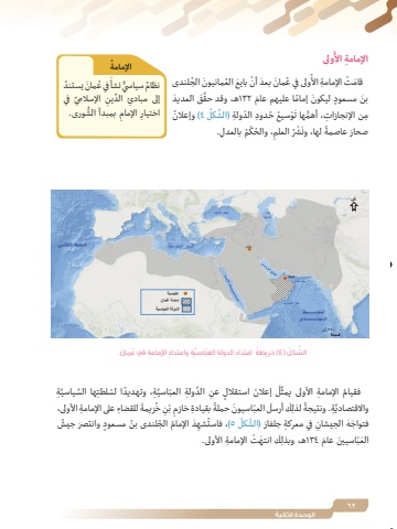 62ُ الوحدة ُ الثانيةُولى ِ اإلمامة األُ َ مان َ بعد ْ أن َ بايع ُ الع َ مانيون ُ الجلندى ُولى في ع َ قام ْت ِ اإلمامة األَّ َق َ العديدَ بن ٍ مسعود َ ليكون ً إمام َ ا عليهم عام 1٣٢هـ، وقد حقُ ٤ ُ )وإعالنَ ْو ُ سيع ُ ح ِ دود ّ الد ِولة َّ )الشكلِم ِ ن اإلنجازات ُّ ، أهمها ت بالعدل. ْ ُم ِِ ُ ، والحكَ ْشُر العلمً لها، ونَ صحار عاصمةَّ ِةِ ِّ ها السياسيَّ ِة ً ، وتهديد ُ ا لسلطتِ َّ الد ِولة ّ العباسي استقالل عنُ َ إعالن ٍِّلُ فقيام ِ اإلمامة األولى يمث للقضاء ِ على اإلمامة األولى، َ ُِزيمةِ خْنِ بً ِ بقيادة خازمَ ّ العب َ اسيون حملةِكَ أرسلً لذلَّ ِة. ونتيجةواالقتصاديَد ُ اإلمام ُ الج ُ لندى بن ٍ مسعود َ وانتصر ُ جيشُِشهُ ٥ ،)فاستِ ِ في معركة َ جلفار َّ )الشكلَ فتواج َه الجيشانِكَ َ انته ْت ِ اإلمامة األولى.َ العّب َ اسيين َ عام 1٣٤هـ، وبذلَّ ِة ِ وامتداد ِ اإلمامة ُ يف ع َمان.ّاسيَّ الش ُكل )٤ ) ُ خريطة ِ امتداد ِ الدولة العبَ ُ في ع َ مان ُ يستندٌ نظام ٌّ سياسي نشأِ ِّ اإلسالمي في إلى مبادئ ِّ الدينِِ ُّ بمبدأ الشورى.ِ اإلماماختيارشالبحر المتوسطبحر العـــــربالمحـــــــــيط الـــهنـــــــــــديبحرقزوينالبحر األسودبغدادصحار٠ ٣٧٠ كمالدولة العباسيةالمحيط األطلسيبحر ُعمانإمامة ُعمانعاصمةُاإلمامة