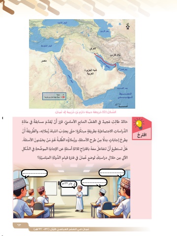 63ُع ُ مان َ في الع ْصِر ِّ العباسي َّ األو ِل )132 -232هـ(ْ ِن ُ خ َ زمية ُ إىل ع َمان.َّ الش ُكل )٥ ) ُ خريطة ِ حملة ِ خازم ببحر العـــــرببحر ُعمانالمحـــــــــيط الـــهنـــــــــــدي٠ ٣٧٠ كم: .... صفحةمصرالبحر المتوسطبحر قزوينالبحر األسودشبه الجزيرةالعربيةبالد فارسحملة بقيادة خازم بن خزيمةالعراقشمدينةالبصرةجزيرة ابن كاوانْ اقترحِ 1٣٢هـفي عامً َّ في ماد ِةُ ِّقد َم مسابقةْن يَِ ِّ األساسي َّ ، قرَر أِ ٌب ُ م ٌ جيد َّ في الص ِّف ّ السابعٌ خالد طالْنَُ أَّريقةِه، والطُمالئَ ٍرة ّ ؛ حت ِ ى يجذ َب َ انتباه زِّ الد ِ راسات َّ االجتماعيِة ٍ بطريقة مبتكَ. ُ ُ ه ْم َ م ْن ِّ يخم َ نون األسئلةَّلبةُه الطُمالؤ األسئلة، وزِ ِ م ْن طرحً َِ يطرح ٍ إجابات بدالِ أسئلة ِ عن اإلجابة َّ الموض ِحة َّ في الشكل ثالثة ٍِ َِ َ معُه باقتراحْن تتفاعلَْ ُ تستطيع أَهلِ َّ الد ِولة ّ العب َّ اسيِة؟ِ ُ ع َ مان ِ في فترة قيامَ لوضعِ ِ دراستكِ اآلتي من خالل