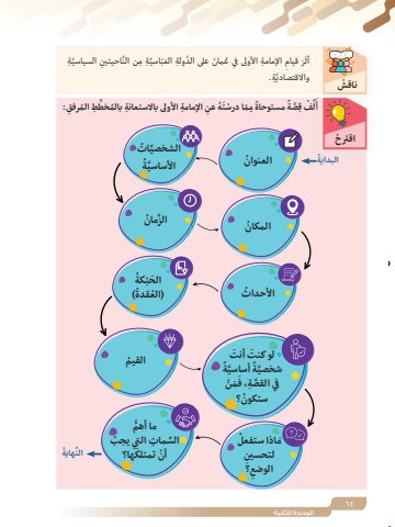 64ُ الوحدة ُ الثانيةْ ناقشِ َّ السياسيِةَّاحيتين من النِ ِ اإلمامة ُ األولى في ع َ مان َّ على الد ِولة َ العّب َّ اسيِة َِر قيامَأثَّ ِة.واالقتصاديِ:َّ ِط ُ المرفقِ ِ اإلمامة ِ األولى باالستعانة ُ بالمخطَ ُه عن م ّم ْ ا درستً ًِ مستوحاةصةِ َِّّ ْف قلَأْ اقترحَّ الشخصي ُ ات ُ العنوانَُّ األساسيةَّ الز ُ مانُ المكانُ األحداثَُ الح ْبكة(ُُ )العقدةَ لو كنت َ أنت ُ القيمًً َّ أساسيةَّ شخصيةَم ْنََّ في القصِة، فُ ستكون؟ُماذا ستفعلِلتحسين؟ِالوضعُّ ما أهمِّ الس ِ مات ُ التي يجبَها؟ْ أن تمتلكُالبدايةُِّهايةالن