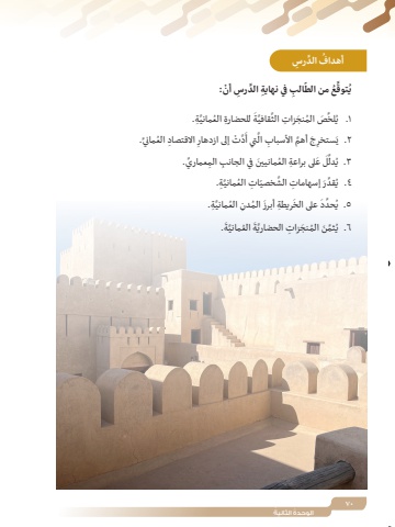 70ُ الوحدة ُ الثانيةرسُ َّ الد ِ أهدافالب ِ في نهاية َّ الد ِرس ْ أن:ّ َِّ ُع من الطُتوقيَّ ِة.َ ِ للحضارة ُ العمانيَّةَّقافيِّ َص ُ الم َنج ِ زات الثُلخ1 .ي االقتصاد ُ العمانيِّ.ِ َِّ ْت إلى ازدهاردََّتي أ األسباب الِ َج َّ أهم َِستخر٢ .ي الم ِّ عماري.َ َ ع ِ لى براعة ُ الع َ مانيين ِ في الجانب ِِّلُدل٣ .يَّ ِة.ّ ِ ات ُ العمانيُ ِّقدَر ِ إسهامات َّ الشخصي٤ .يَّ ِة.ِ ُ العمانيَ ُ المدنَ ِ ريطة أبرزُ ِّحد َد على الخ٥ .يَ.َّةَ ُ العمانيَّةُ ِّثم َن ُ الم َنج ِ زات الحضاري٦ .ي