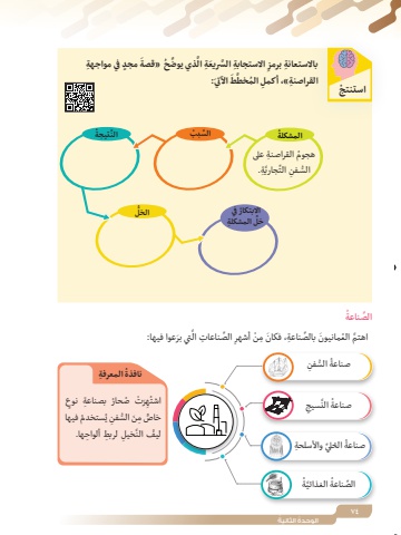 74ُ الوحدة ُ الثانيةَ ٍ مجد ِ في مواجهةَّ ِّ ذي يوض ُح »قصةِ ِ االستجابة َّ الس َ ريع ِة الِ باالستعانة برمزَ اآلتيَ:طَِّ ُ المخطِ القراصنة«، أكملَُّتيجةالنُُّ االبتكار في َ الحل المشكلةِّ َِ حلُالمشكلةُ هجوم ِ القراصنة على َّ ِة.ِّجاريِ التُّ السـفنَّ الس ُ ببُِّ الصناعةَّ َ تي برعوا فيها:ِ ِّ الص ِ ناعات ال م ْن أشهرَّ اهتم ُ الع َ مانيون ِّ بالص ِ ناعة َ ، فكان ٍِِ َر ْت ُ ص ُحار ِ بصناعة نوعُهاشتُ ُ ستخدم فيها ِ يُّ السفن م َنٍّ خاص َِّ ِ خيل ِ لربط ِ ألواحها. ُ ليف النْ استنتجُِ ُّ السفنصناعةُ ُ الح ِّلي ِ واألسلحةصناعةَِّسيجُ النصناعةُُ َّ الغذائيةِّ الصناعةُ ِ المعرفةنافذة