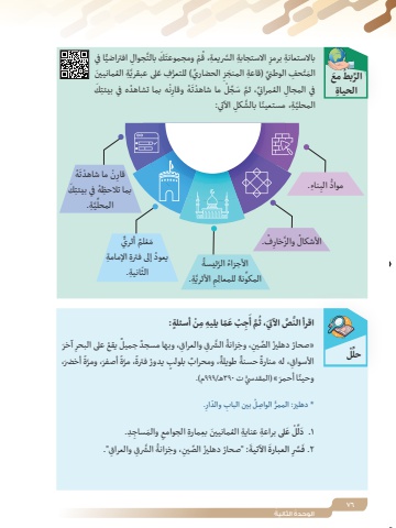 76ُ الوحدة ُ الثانيةُ َ معَّ الربطِ الحياةِ ًّ افتراضيا في َّجوالَ بالتَكُ ْم ومجموعتِ ِ االستجابة َّ الس ِ ريعة، قِ باالستعانة برمزَّ ِة ُ الع َ مانيينِ ِّ الحضاري ُّ ( للتعر ِف َ على عبقريْ ِحف ِّ الوطني ِ )قاعة َ المنجزَ المتَْ ُ ه بما تشاهد ِ ه في بيئتكنَِ ُه وقارْ ْ ما شاهدتِ ُ الع ِّ مراني َّ ، ثم َ س ِّجلفي المجالِ اآلتي: ً َّ ا بالشكلَّ المحليِة، مستعينْلِّحل أسئلة: م ْن ٍِ ْب َ ع ّم ِ ا يليه ِجَم أَُّص َ اآلتي، ثَّ َّاقرأ النِ َ آخرٌ ُ يقع على البحر والعراق ٌ ، وبها مسجد جميلُ َّ الش ِرق ِِ ِ ، وخزانةُ »صحار ُ دهليز ِّ الصينً َ أخضر، ً َ أصفر َّ ، ومرةً َّ ، مرة بلولب ُ يدور فترةٌ ٌ ، ومحراب ٌٍ طويلةٌ حسنةاألسواق، له منارةًِ َ ا أحمر« ُّ )المقدسي ت ٣90هـ/999م(.وحين.ِ بين الباب ّ والدارُ ُِّ * دهليز: الممر ِ الواصلِ ِد.ِ َ والمساجْ َ على ِ براعة ِ عناية ُ الع َ مانيين ِ بع ِ مارة الجوامعِّل1 . َ دل والعراق\. ُ َّ الش ِرق ِِ ِ ، وخزانة: ُ \صحار ُ دهليز ِّ الصينََ اآلتيةِ العبارةَ ِّسر٢ .فِ ِ ناء.ُّ مواد البُف.ُِ َّ والزخاراألشكالُُ األجزاء َّ الرئيسةَّ ِة.ِ األثريِّنةُ للمعالِمالمكوَمْع ٌ لم ٌّ أثريُ يعود ِ إلى فترة ِ اإلمامةّ ِ انية.الثَ ُهْن ْ ما شاهدتِقارَِ بما تالحظ ُه ِ في بيئتكَّيِة.ِّالمحل