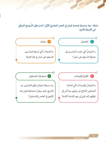 80ُ الوحدة ُ الثانيةَِقِ ُ المرفَّموذجِ ْ ، أجب َ وفق النِ ّ العب ِّ اسي َّ األولِ ُ ع َ مان في العصرَ َ لوحدةِكً سابع َ ا: بعد دراست األسئلة ِ اآلتية:ِ َِعنَّ َ تي دفع ّ ت العب َ اسيين إلى ُ الما العواملُم ِ حاولة َّ الس ِ يطرة ُ على ع َ مان؟َها َّتي اتخذُ ُ واإلجراءات الما العواملّدى إلى َِ َ ع ْن ِ وطن ِ هم مّما أُ الع ُّ ماني َون ِّ للدفاعّ ِ انية؟ُّ تفوِق َ هم الع ِّ سكري ِ في عهد ِ اإلمامة الثِ ُّ تفو ِق ُ الع َ مانيين َ عبرَ لعواملَ بعد ِ معرفتكِ هذا ِ َ ، كيف ِ يمك ُن ُ استثمارها إلبرازّاريخالتِ؟ ِ ُ والم ْس َ تقبلفوق في الحاضرَّ ِالتَ ّ ها العب َ اسيونَّتي أرسلَ ما الح ُ مالت الَ ِ الفترة؟َّ للس ِ يطرة ُ على ع َ مان في تلكت 2 ٌ َ شخيص 1َ و ٌصفِ 4 ُ اقتراح 3 ِ اإلجراءاتُ استشراف ُ الم ْستقبَل