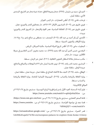 82ُ الوحدة ُ الثانية- العيسائي، سعيد بن سليمان. )1997 .)صحار ودورها الثقافي، حصاد ندوة صحار عبر التاريخ، المنتدى ُ األدبي، سلطنة عمان.- فرحات، فادي. )٢017 .)أطلس الحضارات. دار البدر، الجزائر. - فوزي، فاروق عمر. )٢00٣ .)العباسيون األوائل 1٣٢-٢٤7 ّ هـ. دار مجدالوي للنشر والتوزيع: عمان.- فوزي، فاروق عمر. )٢01٥ .)الخالفة العباسية: عصر القوة واالزدهار. دار الشروق للنشر والتوزيع: بيروت.- الكندي، أبو بكر أحمد بن عبد الله. )٢01٦ .)المصنف، ت: مصطفى بن صالح باجو. م11 ،ج17-18 .وزارة األوقاف والشؤون الدينية: مسقط.- المغلوث، سامي. )٢01٢ .)أطلس تاريخ الدولة العباسية. مكتبة العبيكان، الرياض. - المقدسي، شمس الدين أبو عبد الله محمد )1999 .)ت: محمد مخزوم. أحسن التقاسيم في معرفة األقاليم. بيروت: دار صادر. - مكتب مستشار جاللة السلطان للشؤون الثقافية. )٢0٢0 .) ُ عمان عبر الزمان، مسقط.- المنذري، محمد ناصر راشد. )٢01٥ .)نزوى عاصمة لعمان عام 177هـ المؤهالت والدوافع والنتائج، جريدة الوطن. سلطنة عمان.- الهطالي، ماجد. )٢0٢٤ .)النجد سلة االكتفاء الغذائي في سلطنة عمان. جريدة عمان. سلطنة عمان.- وزارة الثقافة والرياضة والشباب. )٢0٢٤ .) ُ الموسوعة العمانية للناشئة. وزارة الثقافة والرياضة والشباب:مسقط.المواقع اإللكترونية: - فيلم أبناء السندباد الجزء األول باسم إمبراطورية الرياح الموسمية. مسترجع بتاريخ 1٤/10/٢0٢٤م من: qdAQvHaZXLw=v?watch/com.youtube.www://https- قاعة المنجز الحضاري. مسترجع بتاريخ 1٥ /7 / ٢0٢٥م من: tour/om.gov.nm.www://https/- قصة مجد في مواجهة القراصنة. مسترجع بتاريخ 1٤/10/٢0٢٤م من: .youtube.www://httpsv?watch/com=QZJ1٦0�٢dlS- قصر الحمراء. مسترجع بتاريخ 1٤/10/٢0٢٤م من: /com.google.artsandculture://httpsstory/٥-home-from-explore-to-palaces-european/en=hl?٤AURKcELqwEc٣A