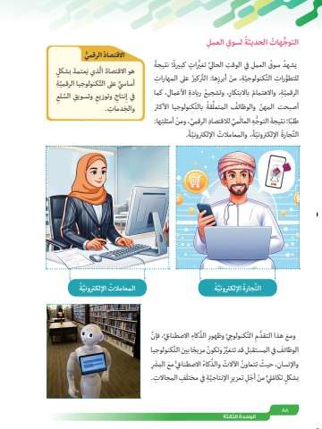 88ُ الوحدة الثالثةِ لسوق العملُ ُِّ التوج ُ هات الحديثةًً؛ نتيجةُّ ٍ رات كبيرة العمل ِ في الوقت الحاليِّ تغيُ يشهد ُ سوق َِّ ُ ركيز ِ على المهاراتِها: التَّ ِة ْ ، من أبرزِّكنولوجيُّ للتطو ِ رات الت األعمال، كما ِ ُ ، وتشجيع ِ ريادة َِّ ِة ُ ، واالهتمام باالبتكارالرقميِّ َ كنولوجيا األكثرُ بالتِّقةُ أصبحت المهن ُ والوظائف المتعلِها: لالقتصاد ِّ الرقمي ْ ، ومن أمثلتَ ِّمي َِ ُّ التوج ِه العالًا؛ نتيجةطلبُ. َّةُ ُ ، والمعامالت اإللكترونيَّةُ اإللكترونيِّجارةالتُ ُّ الرقمياالقتصادٍَ ُ عتمد بشكلَّذي يُ هو االقتصاد الِّ َّ كنولوجيا الرقميِةٍّ أساسي على التِِ ِّ السلعِ وتسويقِ وتوزيعِنتاجفي إِ والخ ِ دمات.ُُ َّ اإللكترونيةِّجارةُ التُ المعامالت َّ اإللكترونيةَّ ِكاء االصطناعيِّ َّ ، فإنِ الذِّكنولوجيِّ وظهورِ التُّ هذا التقدمَ ومعِّكنولوجيا َُّر ُ وتكون ً مزيج َ ا بين التَ ِل قد تتغيَ الوظائف في المستقبُِّ َ مع َ البشرَّ ُ كاء االصطناعيِ ُ ، حيث ُ تتعاون ُ اآلالت والذواإلنسانَ ِف ِ المجاالت.َّ ِة في مختلِ اإلنتاجيٍّ ْ من ْ أج ِل تعزيزبشكل ُ تكامليٍ