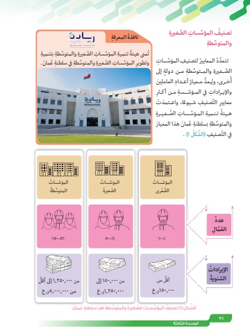96ُ الوحدة الثالثةُ تصنيف َّ المؤس ِ سات َّ الص ِ غيرةِّ والمتوس ِطةُ ُ المعايير ِ لتصنيف َّ المؤس ِ سات َّ تتعددَّ الص ِ ــغيرة ِّ والمــتوس ِطة ٍ مــن دولة إلى ِ َ ين أعــداد العاملــعد ُ مــعيار ُِ ُُّخــرى، ويأِــــسة مــن أكــثرِ واإليــرادات َّ في المــؤس َِّ ِ صنيف ً شــيوع َ ا، واعــتمد ْتِ التمعاييرُ ِ تـنـمية َّ المــؤس ِ ــسات َّ الص ِ ــغـيــرةهــيئةُ َ مان َ هذا المعيارِّ والمتوس ِطة ِ بسلطنة عُ 1. )َّ ِ صنيف َّ )الشكلفي التَّ المؤس ُ ساتْرىُّ الصغ1-10 من ُّأقل000,1٥0ر.عمن 000,1٥0 إلى 000,٢٥0,1ر.عَّمن 000,٢٥0,1 إلى أقلمن 000,000,٥ر.عُعددِمالُ الع ََّّ المؤس ُ ساتَُّ الصغيرة11-٥0َّ المؤس ُ ساتُِّ المتوسطة٥1-1٥0 ع َمان.َّ الش ُكل )1 ) ُ تصنيف َّ املؤس ِسات َّ الص ِ غرية ِّ واملتوس ِطة ِ يف سلطنة ُُ ِ المعرفةنافذةُ ِ تنمية َّ المؤس ِ سات َّ الص ِ غيرة ِّ والمتوس ِطة ِ بتنميةُعنى هيئةتِ َّ المؤس ِ سات َّ الص ِ غيرة ِّ والمتوس ِطة ِ في سلطنة ُ ع َ مان.وتطويرُ اإليراداتَُّ السنوية