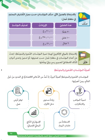 97ُ االقتصاد ُ الع ُّ ماني ُ : سوق ِ العمل َّ والمؤس ُسات َّ الص ُ غيرة ِّ والمتوس ُطة المواهبُ ِتنميةِ واالبتكارات. ُ من االستفادةِ خامات ِ البيئة.ُ مستوى زيادةِ دخل ِ األفراد.ِّاتجُ اإلسهام في النِّ اإلجماليِّ.ِّيالمحلُ ِرصُ توفير فٍ عمل.ِّ ْفصنَّ ْص ِ نيف َ المعتم ِدِ التِّ َّ ف المؤس ِ سات َ حسب معيارِ اآلتي، صنِ ِ عانة بالجدولِاالستبلطنة ُ ع َ مان: َ في س ُِ تصنيف عدد َّ المؤس ِسة ُ َ العاملين ُ اإليرادات000,٢00 ر.ع000,000,٣٥0 ر.ع000,1٢0 ر.عً٣0 عامال عامل100ٍ ال9 ّ عم ٍِّ ْقطبِ اإللكترونيِّ ِ لهيئة ِ تنمية َّ المؤس ِ سات َّ الص ِ غيرة ِّ والمتوس ِطة ْ ، ابحثِ ِ عانة بالموقعِاالستب استع ْن ِ بإحدى أدواتَّم ُُِ َ مان َ حسب ِ تصنيفها، ث أعداد َّ المؤس ِ سات ِ في سلطنة عْعن ٍِّ ِّ يوض ُحها.ٍ بيانيِ رسمَّ ِكاء االصطناعيِّ لتصميمالذُ َّ المؤس ِ سات َّ الص ِ غيرة ِّ والمتوس ِطةَّ أهميةُ ِولَّ ِة ِ في العديد ْ من دِ االقتصاديعد َّ من الدعائمُ ُّْ تٌ، إذٌ كبيرةَّة َّ للمؤس ِ سات َّ الص ِ غيرة ِّ والمتوس ِطة أهميِها:َّتِ ْ ، ومن أهميَمالعال