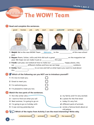 8 eightWelcomeLesson 1, part 2 The WOW! Team1 Read and complete the sentences.good homes job safe start wear welcome writing year1 Majid: We're the new WOW! Team. Welcome to the of this new school year.2 Bayan: Reem, Sultan, Jullia and Arlo did such a great on the magazine last year. We hope we can make it just as this year.3 Frank: Last year, we looked at how to make our happy places, why we different clothes and how we can keep outdoors.4 Emily: Start to us now and tell us what topics you want to read about this !2 Which of the following can you NOT use to introduce yourself?1 It’s nice to meet you. 2 Great to meet you. 3 I’m welcoming you. 4 I’m pleased to meet you too. 3 Match the two parts of the sentences.1 He's the writer who2 I want to fi nd out what you call3 Next summer, I’m going to go on4 I’m going to go on holiday with 5 It was raining yesterday buta my family and I’m very excited.b a plane for the fi rst time!c today it's very hot.d different parts of animals.e wrote a famous book about anold palace.entertainment animals travel the seasons 4 Which of the topics from Activity 3 are the most interesting? Write why.