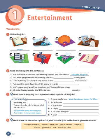 1 Write the jobs. 3 Read the I’m learning box. Then write descriptions of the jobs.4 Write three or more descriptions of jobs. Use the jobs in the box or your own ideas.2 Read and complete the sentences. 1 Hanan’s creative and she likes making clothes. She should be a costume designer . 2 This news programme is interesting and the is very good. 3 I like watching TV talent shows. Some of the are excellent!4 I’ve read this book four times! It’s by my favourite . 5 You’re very good at telling funny stories. You would be a great . 6 My sister loves puppets. She'd like to be a one day.camera operator farmer mechanic police offi cer scientistwaiter performer vet make-up artistI’m learningDescribing jobsYou can describe jobs by saying what the people do.A puppeteer works with puppets.A comedian makes people laugh.1 A stunt performer does dangerous things for fi lms. 2 An animator 3 A bus driver 4 A clown 5 A costume designer 6 A chef 1 writer 5 2 6 4 8 3 7 Vocabulary101 EntertainmentLesson 1, part 2 ten