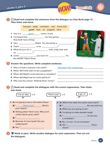 4 Work in pairs. Write another dialogue for each expression. Then act outthe dialogues.3 1.5 Read and complete the dialogues with the correct expressions. Then listenand check.1 1.4 Read and complete the sentences from the dialogue on Class Book page 17.Then listen and check.1 You’re a great clown, Frank.2 I’ve heard that are like guitars they both have strings.3 Very , Majid. You should be a !4 That’s . Is he ?5 What do you call a with a big nose and no ?6 Come , you two! It’s forthe WOW! Talent Show.2 Answer the questions. Write complete sentences.1 Why is Frank’s costume a bit small? He’s had it for a long time. 2 When did Frank start to be a puppeteer? 3 When did Majid’s uncle become a comedian? 4 When did Majid see his uncle perform? 5 Why was the answer ‘Nobody Nose’ funny? 1 A: I’m going to be in the talent show! B: 1 That’s cool! What’s your talent? A: Telling jokes! Here’s one. Why can’ta bike stand up by itself?B: 2A: Because it’s two-tyred! Do you understand?B: Yes, 32 A: What time does the talent show start?B: 4 No one told me. A: What are you going to do? B: I’m going to make people laugh. A: 5 So are youa comedian?B: No, I’m not. I’m an animator!A: Oh, 6 That’s clever! because body comedian cool funny (x2) great man on puppets timeI’ve no idea. x 2 That’s cool! x 2 I get it! x 2111 WOW!Lesson 2, part 2Team Talkeleven