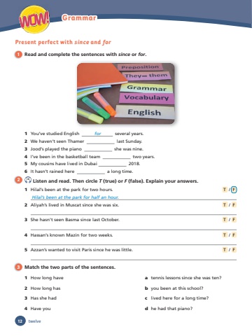 Present perfect with since and for1 Read and complete the sentences with since or for.1 You’ve studied English for several years.2 We haven’t seen Thamer last Sunday.3 Jood’s played the piano she was nine. 4 I’ve been in the basketball team two years.5 My cousins have lived in Dubai 2018.6 It hasn’t rained here a long time. 2 1.8 Listen and read. Then circle T (true) or F (false). Explain your answers.1 Hilal’s been at the park for two hours. T / F Hilal’s been at the park for half an hour. 2 Aliyah’s lived in Muscat since she was six. T / F3 She hasn't seen Basma since last October. T / F4 Hassan’s known Mazin for two weeks. T / F5 Azzan’s wanted to visit Paris since he was little. T / F3 Match the two parts of the sentences.1 How long have a tennis lessons since she was ten?2 How long has b you been at this school?3 Has she had c lived here for a long time?4 Have you d he had that piano?12WOW! Grammartwelve