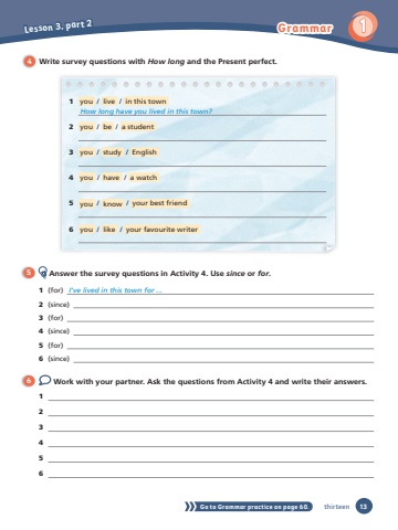 4 Write survey questions with How long and the Present perfect.5 Answer the survey questions in Activity 4. Use since or for.1 (for) I’ve lived in this town for ... 2 (since) 3 (for) 4 (since) 5 (for) 6 (since) 6 Work with your partner. Ask the questions from Activity 4 and write their answers.123 4561 you / live / in this town How long have you lived in this town?2 you / be / a student3 you / study / English4 you / have / a watch5 you / know / your best friend6 you / like / your favourite writerGo to Grammar practice on page 60. 13Lesson 3, part 2Grammar 1thirteen