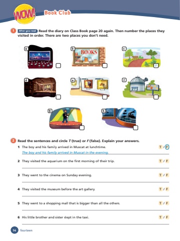 WOW! Book Club1 After you read Read the diary on Class Book page 20 again. Then number the places they visited in order. There are two places you don’t need.2 Read the sentences and circle T (true) or F (false). Explain your answers.1 The boy and his family arrived in Muscat at lunchtime. T / FThe boy and his family arrived in Muscat in the evening.2 They visited the aquarium on the fi rst morning of their trip. T / F3 They went to the cinema on Sunday evening. T / F4 They visited the museum before the art gallery. T / F5 They went to a shopping mall that is bigger than all the others. T / F6 His little brother and sister slept in the taxi. T / Fadg hbec1f14 fourteen