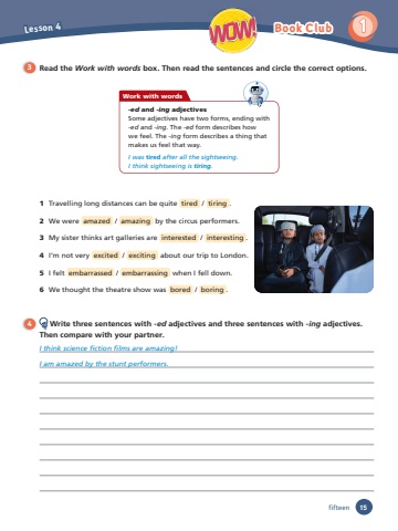 Lesson 41 WOW! Book Club3 Read the Work with words box. Then read the sentences and circle the correct options.Work with words-ed and -ing adjectivesSome adjectives have two forms, ending with -ed and -ing. The -ed form describes how we feel. The -ing form describes a thing that makes us feel that way.I was tired after all the sightseeing. I think sightseeing is tiring. 1 Travelling long distances can be quite tired / tiring .2 We were amazed / amazing by the circus performers. 3 My sister thinks art galleries are interested / interesting .4 I’m not very excited / exciting about our trip to London.5 I felt embarrassed / embarrassing when I fell down.6 We thought the theatre show was bored / boring .4 Write three sentences with -ed adjectives and three sentences with -ing adjectives.Then compare with your partner.I think science fi ction fi lms are amazing! I am amazed by the stunt performers. fifteen 15