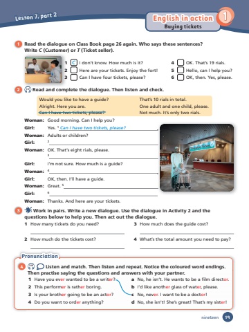 Lesson 7, part 2English in action 119Buying ticketsnineteen1 Read the dialogue on Class Book page 26 again. Who says these sentences?Write C (Customer) or T (Ticket seller). Woman: Good morning. Can I help you?Girl: Yes. 1 Can I have two tickets, please? Woman: Adults or children? Girl: 2Woman: OK. That’s eight rials, please. 3Girl: I’m not sure. How much is a guide? Woman: 4Girl: OK, then. I’ll have a guide. Woman: Great. 5Girl: 6Woman: Thanks. And here are your tickets. 2 1.17 Read and complete the dialogue. Then listen and check.3 Work in pairs. Write a new dialogue. Use the dialogue in Activity 2 and the questions below to help you. Then act out the dialogue. 1 How many tickets do you need? 2 How much do the tickets cost? 3 How much does the guide cost? 4 What’s the total amount you need to pay?Would you like to have a guide? That’s 10 rials in total.Alright. Here you are. One adult and one child, please.Can I have two tickets, please? Not much. It’s only two rials.Pronunciation 4 1.18 Listen and match. Then listen and repeat. Notice the coloured word endings. Then practise saying the questions and answers with your partner.1 Have you ever wanted to be a writer? 2 This performer is rather boring. 3 Is your brother going to be an actor? 4 Do you want to order anything? a No, he isn’t. He wants to be a fi lm director. b I’d like another glass of water, please.c No, never. I want to be a doctor!d No, she isn’t! She’s great! That’s my sister!1 C I don’t know. How much is it?2 Here are your tickets. Enjoy the fort! 3 Can I have four tickets, please?4 OK. That’s 19 rials. 5 Hello, can I help you?6 OK, then. Yes, please.