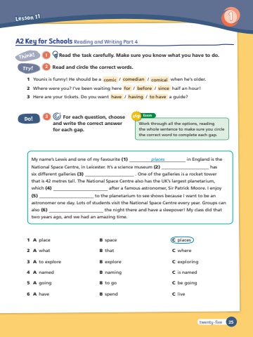 Lesson 11125A2 Key for Schools Reading and Writing Part 42 Read and circle the correct words.1 Younis is funny! He should be a comic / comedian / comical when he’s older. 2 Where were you? I’ve been waiting here for / before / since half an hour!3 Here are your tickets. Do you want have / having / to have a guide?1 A place2 A what3 A to explore4 A named5 A going6 A haveB spaceB thatB exploreB namingB to goB spendC placesC whereC exploringC is namedC be goingC live3 For each question, choose and write the correct answerfor each gap.1 Read the task carefully. Make sure you know what you have to do. Think!Try!Do!My name’s Lewis and one of my favourite (1) places in England is the National Space Centre, in Leicester. It’s a science museum (2) has six different galleries (3) . One of the galleries is a rocket tower that is 42 metres tall. The National Space Centre also has the UK’s largest planetarium, which (4) after a famous astronomer, Sir Patrick Moore. I enjoy (5) to the planetarium to see shows because I want to be an astronomer one day. Lots of students visit the National Space Centre every year. Groups can also (6) the night there and have a sleepover! My class did that two years ago, and we had an amazing time.Work through all the options, readingthe whole sentence to make sure you circle the correct word to complete each gap.tip Examtwenty-five