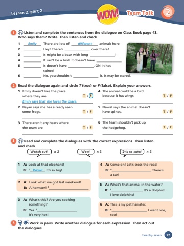 4 Work in pairs. Write another dialogue for each expression. Then act outthe dialogues.3 2.5 Read and complete the dialogues with the correct expressions. Then listenand check.1 2.4 Listen and complete the sentences from the dialogue on Class Book page 43. Who says them? Write. Then listen and check.2 Read the dialogue again and circle T (true) or F (false). Explain your answers.Watch out! x 2 Wow! x 2 It’s so cute! x 2272 WOW!Lesson 2, part 2Team Talktwenty-seven1 Emily There are lots of different animals here. 2 Hey! There’s over there! 3 It might be a bear with long ! 4 It can’t be a bird. It doesn’t have .5 It doesn’t have . Oh! It hasspines!6 No, you shouldn’t it. It may be scared.1 A: Look at that elephant! B: 1 Wow! It’s so big!2 A: Look what we got last weekend!B: A hamster! 23 A: What’s this? Are you cooking something?B: Yes. 3It’s very hot!5 A: What’s that animal in the water?B: 5 It’s a dolphin!I love dolphins!4 A: Come on! Let’s cross the road.B: 4 There’sa car! 6 A: This is my pet hamster.B: 6 I want one, too!1 Emily doesn’t like the placewhere they are. T / FEmily says that she loves the place. 2 Bayan says she has already seen some frogs. T / F3 There aren’t any bears where the team are. T / F4 The animal could be a bird because it has wings. T / F5 Nawal says the animal doesn’t have spines. T / F6 The team shouldn’t pick up the hedgehog. T / F