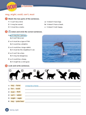 may, might, could, can't, must 1 Match the two parts of the sentences.1 It can’t be a bird. a It doesn’t have legs.2 It may be scared. b It doesn’t have a beak.3 It must be a snake. c It doesn’t look happy.2 2.8 Listen and circle the correct sentences. 1 a It may be a person. b It can’t be a cat. 2 a It must be a type of fi sh. b It could be a dolphin. 3 a It could be a large rabbit. b It must be the neighbour’s cat.4 a It can’t be a bee. b It may be dangerous. 5 a It could be a sheep. b It might be a wild goat.3 Look and write sentences.1 2 3 4 5 61 may / horse It may be a horse. 2 lion / could3 must / duck4 can‘t / rabbit5 might / eagle6 may / polar bear28WOW! Grammartwenty-eight