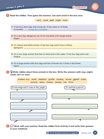4 Read the riddles. Then guess the answers. Use each word in the box once.can’t could may might must1 It has four short legs and a long tail. It has scales on its body. (crocodile) It may be a crocodile. 2 It’s a very big, dangerous cat. Its fur has black and orange stripes. (tiger) 3 It’s a black and white animal. It has four legs and it lives in Africa. (penguin) 4 It’s a very large animal that lives on land and in the water. It has four legs and a tail. (hippo) 5 It’s a large animal with four legs and lots of brown fur. It lives in the forest. (bear) 5 Write riddles about three animals in the box. Write the answers with may, might, could, can’t or must.Arabian oryx camel elephant giraffe monkey mouse parrot snaketortoise zebra chicken donkey bat rhinoIt has wings and it lives in the jungle. It could be a parrot.6 Work with your partner. Read the riddles from Activity 4 and write their guessesin your notebook.Go to Grammar practice on page 61. 29Lesson 3, part 2Grammar 2twenty-nine