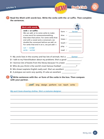 2 WOW! Book Club3 Read the Work with words box. Write the verbs with the -er suffi x. Then completethe sentences.Work with wordsverb + -er suffi xWe can add -er to some verbs to makea new word for someone/somethingthat does that action. For some verbs that end with a vowel and a consonant, we double the consonant before we add -er. For verbs that end in an e, we just add -r.run → runnerwrite → writerfarm → farmer dive →listen →teach →play →read →1 My uncle lives in the country and has lots of animals. He’s a farmer .2 I talk to my friend Budoor about my problems. She’s a good . 3 I borrow lots of books from the library because I’m a keen .4 Who do you think is the world’s most famous football ? 5 Mrs Amani explains English really well. She’s an excellent . 6 A platypus can swim very quickly. It’s also an excellent . 4 Write sentences with the -er form of the verbs in the box. Then comparewith your partner.clean sing design perform run teach writeMy aunt loves drawing clothes. She's a costume designer. Lesson 4thirty-one 31