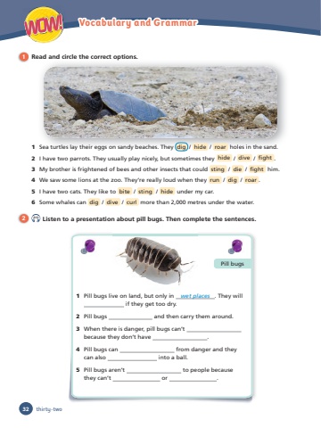 thirty-two1 Pill bugs live on land, but only in wet places . They will if they get too dry.2 Pill bugs and then carry them around.3 When there is danger, pill bugs can’t because they don’t have . 4 Pill bugs can from danger and they can also into a ball. 5 Pill bugs aren’t to people because they can’t or . Pill bugs1 Read and circle the correct options. p1 Sea turtles lay their eggs on sandy beaches. They dig / hide / roar holes in the sand. 2 I have two parrots. They usually play nicely, but sometimes they hide / dive / fi ght . 3 My brother is frightened of bees and other insects that could sting / die / fi ght him. 4 We saw some lions at the zoo. They’re really loud when they run / dig / roar . 5 I have two cats. They like to bite / sting / hide under my car. 6 Some whales can dig / dive / curl more than 2,000 metres under the water.2 2.12 Listen to a presentation about pill bugs. Then complete the sentences.32WOW! Vocabulary and Grammar