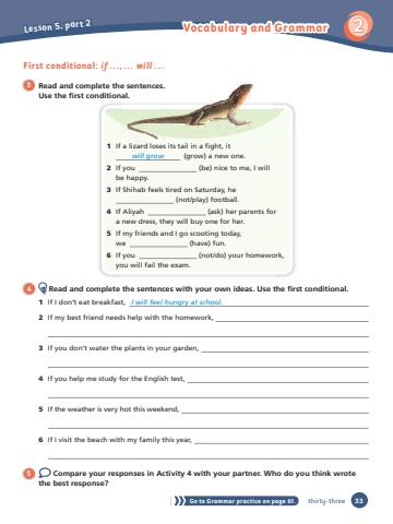 thirty-three3 Read and complete the sentences.Use the fi rst conditional.4 Read and complete the sentences with your own ideas. Use the fi rst conditional.1 If I don’t eat breakfast, I will feel hungry at school. 2 If my best friend needs help with the homework, 3 If you don’t water the plants in your garden, 4 If you help me study for the English test, 5 If the weather is very hot this weekend, 6 If I visit the beach with my family this year, 5 Compare your responses in Activity 4 with your partner. Who do you think wrote the best response?1 If a lizard loses its tail in a fi ght, it will grow (grow) a new one. 2 If you (be) nice to me, I willbe happy.3 If Shihab feels tired on Saturday, he (not/play) football. 4 If Aliyah (ask) her parents fora new dress, they will buy one for her. 5 If my friends and I go scooting today, we (have) fun. 6 If you (not/do) your homework, you will fail the exam. e sentences.al.First conditional: if …, … will …Go to Grammar practice on page 61. 33Lesson 5, part 2Vocabulary and Grammar 2