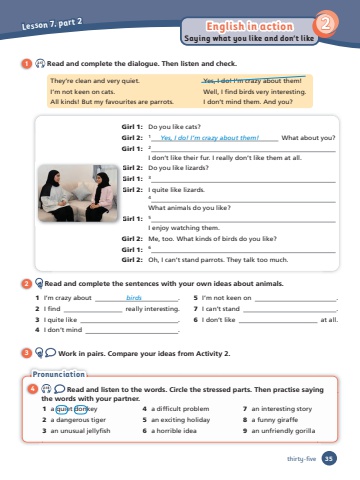 Lesson 7, part 2English in action 235Saying what you like and don’t likethirty-five1 2.17 Read and complete the dialogue. Then listen and check.They’re clean and very quiet. Yes, I do! I’m crazy about them! I’m not keen on cats. Well, I fi nd birds very interesting.All kinds! But my favourites are parrots. I don’t mind them. And you?2 Read and complete the sentences with your own ideas about animals.3 Work in pairs. Compare your ideas from Activity 2.1 I’m crazy about birds . 2 I fi nd really interesting.3 I quite like .4 I don’t mind .5 I’m not keen on .7 I can’t stand .6 I don’t like at all.Girl 1: Do you like cats?Girl 2: 1 Yes, I do! I’m crazy about them! What about you?Girl 1: 2I don’t like their fur. I really don’t like them at all.Girl 2: Do you like lizards?Girl 1: 3Girl 2: I quite like lizards.4What animals do you like?Girl 1: 5I enjoy watching them.Girl 2: Me, too. What kinds of birds do you like?Girl 1: 6Girl 2: Oh, I can’t stand parrots. They talk too much.Pronunciation 4 2.18 Read and listen to the words. Circle the stressed parts. Then practise saying the words with your partner.1 a quiet donkey2 a dangerous tiger 3 an unusual jellyfi sh 4 a diffi cult problem5 an exciting holiday6 a horrible idea 7 an interesting story8 a funny giraffe9 an unfriendly gorilla
