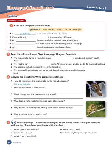 Reading4 Work in groups. Choose an animal you know about. Discuss the questions and make notes. Then share your ideas with the class.1 What type of animal is it?2 Where does it live?3 What does it look like?4 What does it eat?5 Is there anything strange about it?2 Read the information on Class Book page 54 again. Complete.1 The mata mata turtle is found in many , ponds and rivers in South America.2 This reptile can up to 15 kilogrammes and be up to 45 centimetres long.3 The giant prickly stick insect lives in the forests of .4 This unusual invertebrate can be up to 20 centimetres long and it has very long . 3 Answer the questions. Write complete sentences.1 How do you know the mata mata turtle has a backbone? It is a vertebrate. 2 How do you know it likes water?3 What things does the mata mata turtle eat? 4 Why does a mata mata turtle need such a long nose? 5 Why do you think the giant prickly stick insect lives in forests?6 Why are these insects hard to see?Words in context1 Read and complete the defi nitions.1 A vertebrate is an animal that has a backbone.2 If something is , it is unusual or different.3 An is an animal that doesn’t have a backbone. 4 A has hard scales all over its body and it lays eggs. 5 An is an invertebrate that has six legs. vertebrate invertebrate insect reptile strange36Lesson 8, part 2Literacy: an information textthirty-six