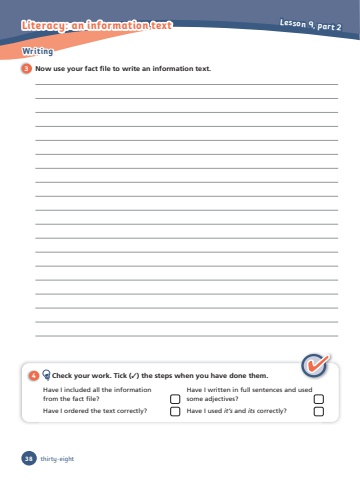 WritingLesson 33 Now use your fact fi le to write an information text.4 Check your work. Tick (✓) the steps when you have done them. Have I included all the informationfrom the fact fi le?Have I ordered the text correctly?Have I written in full sentences and used some adjectives? Have I used it’s and its correctly?38 thirty-eightLesson 9, part 2Literacy: an information text