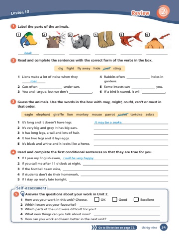 Lesson 4Review1 Lions make a lot of noise when they roar . 2 Cats often under cars.3 You and I argue, but we don’t .4 Rabbits often holes ingardens. 5 Some insects can you.6 If a bird is scared, it will .1 Label the parts of the animals.2 Read and complete the sentences with the correct form of the verbs in the box.dig fi ght fl y away hide roar sting3 Guess the animals. Use the words in the box with may, might, could, can’t or must in that order.eagle elephant giraffe lion monkey mouse parrot snake tortoise zebra1 It’s long and it doesn’t have legs. It may be a snake. 2 It’s very big and grey. It has big ears. 3 It has long legs, a tail and lots of hair. 4 It has two legs and it lays eggs. 5 It’s black and white and it looks like a horse. 4 Read and complete the fi rst conditional sentences so that they are true for you.1 If I pass my English exam, I will be very happy. 2 If you call me after 11 o’clock at night, 3 If the football team wins, 4 If students don’t do their homework, 5 If I stay up really late tonight, Self-assessment5 Answer the questions about your work in Unit 2.1 How was your work in this unit? Choose. OK Good Excellent2 Which lesson was your favourite? 3 Which parts of the unit were diffi cult for you? 4 What new things can you talk about now? 5 How can you work and learn better in the next unit? 1 beak 2 3 4 5 6Go to Dictation on page 72. 39Review 2thirty-nineLesson 10