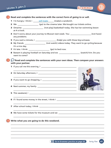 3 Read and complete the sentences with the correct form of going to or will.1 I’m hungry. I think I will make (make) a sandwich.2 We (go) to the cinema later. We bought our tickets online. 3 Omaima (not play) basketball today. She has her swimming lessonat 4 o’clock.4 Don’t worry about your journey to Muscat next week. You (not have) any problems. 5 If you wait a minute, I (help) you with those big suitcases.6 My friends (not watch) videos today. They want to go cycling becauseit’s a nice day.7 It’s late. I think (go) to bed now.8 Bassam is playing football on Saturday and we (watch) him. Do you want to come?4 Read and complete the sentences with your own ideas. Then compare your answers with your partner.1 If you call me this evening, I 2 On Saturday afternoon, I 3 If you want to go shopping, I 4 Next summer, my family 5 This weekend, I 6 If I found some money in the street, I think I 7 After school today, I think 8 We have some tickets for the museum and we 5 Write what you are going to do this weekend.Go to Grammar practice on page 62. 45Lesson 3, part 2Grammar 3forty-five