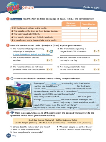 WOW! Culture Lesson 6, part 150 fifty1 After you read Read the text on Class Book page 76 again. Tick (✓) the correct railway.2 Read the sentences and circle T (true) or F (false). Explain your answers.3 3.14 Listen to an advert for another famous railway. Complete the text.4 Work in groups. Choose one of the railways in the box and fi nd answers to the questions. Write about your famous railway.Black Sea Express (Bulgaria) California Zephyr (USA)Oslo to Bergen (Norway) The Blue Train (South Africa) The Ghan Train (Australia) 1 Where does the railway start and fi nish?2 How far does the train travel?3 How long does the journey take?4 What can people see as they travel?5 What is unusual about this railway?1 The Haramain High-Speed railwayonly stops at two places. T / FIt stops in Makkah, Jeddah and Madinah. 2 The Haramain trains are notvery fast. T / F3 The Haramain trains do not have problems in the hot Saudi summers. T / F4 The Trans-Siberian journey islonger than 9,000 kilometres. T / F5 You can fi nish the Trans-Siberian journey in one day. T / F6 Not many people take food on the Trans-Siberian train. T / FIf going on 1 slow but amazing train rides is whatyou like, you should buy a 2 for the GlacierExpress. This 3 railway in Switzerland travels between Zermatt and St. Moritz. It takes about 4hours to travel 290 kilometres through high 5 , deep valleys and beautiful 6 . The train goes through 7 and over hundreds of bridges. The 8 part of the journey is the Oberalp Pass, which is about 2,130 metres high. The train’s very large 9 will let you enjoy a fantastic view. Don’t forget your 10 ! IfyEbhdt8aleHaramainHigh-Speed Trans-Siberian1 It’s the longest railway in the world. ✓2 The people on the train go from Europe to Asia.3 The train travels at 300 kmh.4 You start in Makkah and fi nish in Madinah.5 It travels next to the deepest lake in the world.