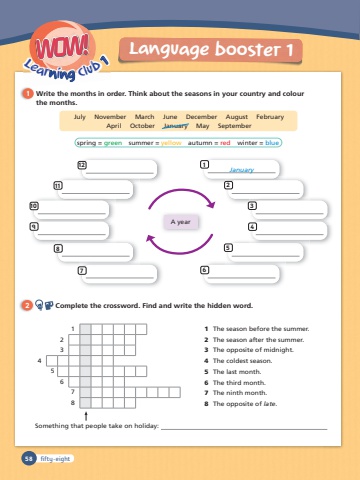 Language booster 158n ngL1earning ClubL1eL ar i ClubWOW! Lear i ClubWOW!July November March June December August FebruaryApril October January May Septemberspring = green summer = yellow autumn = red winter = blue1 The season before the summer.2 The season after the summer.3 The opposite of midnight.4 The coldest season.5 The last month.6 The third month.7 The ninth month.8 The opposite of late.Something that people take on holiday: 12345678 January A year123457 6891011121 Write the months in order. Think about the seasons in your country and colourthe months.2 Complete the crossword. Find and write the hidden word.fifty-eight