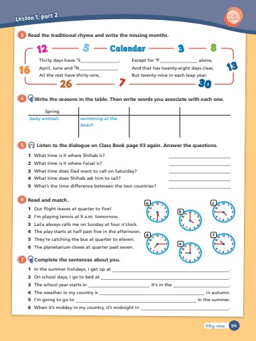59adbecf2612753 83013Thirty days have 1S ,April, June and 2N .All the rest have thirty-one,Except for 3F alone,And that has twenty-eight days clear,But twenty-nine in each leap year. 16CalendarLC1 Lesson 1, part 23 Read the traditional rhyme and write the missing months. 4 Write the seasons in the table. Then write words you associate with each one.5 LC1.3 Listen to the dialogue on Class Book page 93 again. Answer the questions.6 Read and match.7 Complete the sentences about you.fifty-nineSpringbaby animals swimming at the beach1 What time is it where Shihab is? 2 What time is it where Faisal is? 3 What time does Dad want to call on Saturday? 4 What time does Shihab ask him to call? 5 What’s the time difference between the two countries? 1 Our fl ight leaves at quarter to fi ve!2 I‘m playing tennis at 9 a.m. tomorrow. 3 Laila always calls me on Sunday at four o’clock. 4 The play starts at half past fi ve in the afternoon.5 They‘re catching the bus at quarter to eleven.6 The planetarium closes at quarter past seven.1 In the summer holidays, I get up at .2 On school days, I go to bed at .3 The school year starts in . It‘s in the .4 The weather in my country is in autumn.5 I‘m going to go to in the summer.6 When it’s midday in my country, it’s midnight in .
