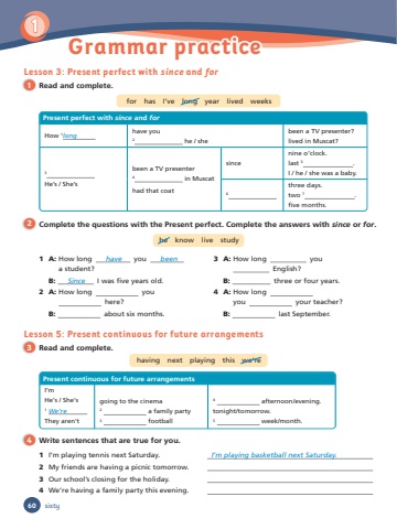 Lesson 3: Present perfect with since and for1 Read and complete.Lesson 5: Present continuous for future arrangements3 Read and complete.2 Complete the questions with the Present perfect. Complete the answers with since or for. 4 Write sentences that are true for you.Present perfect with since and forHow 1long have you2 he / shebeen a TV presenter?lived in Muscat?3He’s / She’sbeen a TV presenter 4 in Muscathad that coatsincenine o’clock.last 5 .I / he / she was a baby. 6three days.two 7 .fi ve months.Present continuous for future arrangementsI’mHe's / She's1 We’re They aren'tgoing to the cinema2 a family party3 football4 afternoon/evening.tonight/tomorrow.5 week/month.1 A: How long have you been a student?B: Since I was fi ve years old. 2 A: How long you here?B: about six months.3 A: How long you English?B: three or four years.4 A: How long you your teacher?B: last September. 601sixtyGrammar practicefor has I’ve long year lived weekshaving next playing this we’rebe know live study 1 I’m playing tennis next Saturday. I’m playing basketball next Saturday. 2 My friends are having a picnic tomorrow. 3 Our school’s closing for the holiday. 4 We’re having a family party this evening.