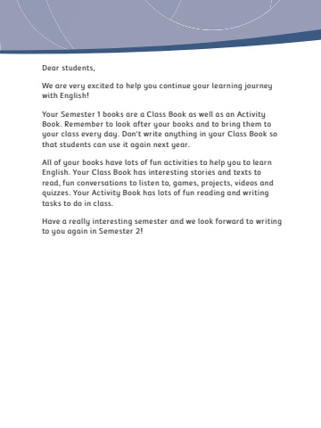 Dear students,We are very excited to help you continue your learning journey with English!Your Semester 1 books are a Class Book as well as an Activity Book. Remember to look after your books and to bring them to your class every day. Don't write anything in your Class Book so that students can use it again next year.All of your books have lots of fun activities to help you to learn English. Your Class Book has interesting stories and texts to read, fun conversations to listen to, games, projects, videos and quizzes. Your Activity Book has lots of fun reading and writing tasks to do in class.Have a really interesting semester and we look forward to writing to you again in Semester 2!