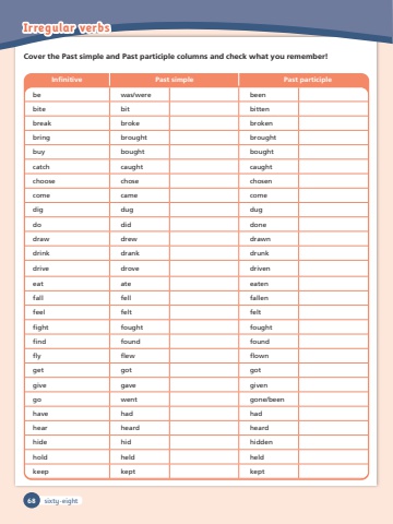Infi nitive Past simple Past participlebe was/were beenbite bit bittenbreak broke brokenbring brought broughtbuy bought boughtcatch caught caughtchoose chose chosencome came comedig dug dugdo did donedraw drew drawndrink drank drunkdrive drove driveneat ate eatenfall fell fallenfeel felt feltfi ght fought foughtfi nd found foundfl yfl ew fl ownget got gotgive gave givengo went gone/beenhave had hadhear heard heardhide hid hiddenhold held heldkeep kept keptCover the Past simple and Past participle columns and check what you remember!68 sixty-eightIrregular verbs