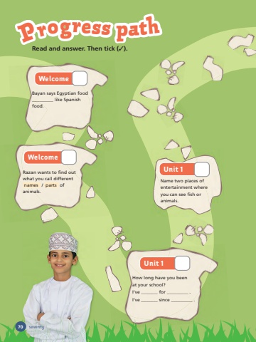 PRead and answer. Then tick (✓). rogress pathName two places of entertainment where you can see fi sh or animals.Unit 1Bayan says Egyptian food _________ like Spanish food.WelcomeRazan wants to fi nd out what you call different names / parts of animals. WelcomeHow long have you been at your school?I’ve _______ for _________ .I’ve _______ since _________ .Unit 170 seventy