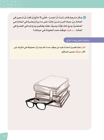 يــف َنيعــست َ نْإ ُ تــلُّقَّ ْ نْإ ُ غُــلابأَ لا يـِ عَل« :)رَــصِبأَ ْ نْأَ ُ تُدرأَ( بَاــتكُ مِــجرَتمُ رَــكُذي 1٠ هُــ ِ ترَظنَّ يــف يــباجيإ رَــثُأَ اــهل ُ نْوــكي ٍ تُايصِخــشَّب هُــ ِ تايح يــف ُ نْاــسنَّلإا رَــمي ٤