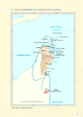 6.14 THE ADMINISTRATIVE SOPE OF AL BURAYMI 6.13 THE ADMINISTRATIVE SOPE OF MUSANDAM 56°0'E 56°30'E 26°30'N 26°30'N 26°0'N 26°0'N 25°30'N 25°30'N 56°0'E 56°30'E *Map legend : Refer to page(61) 52
