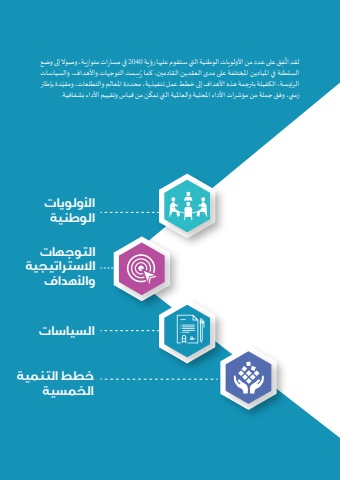 الأولويات الوطنية التوجهات الاستراتيجية والأهدافالسياساتخطط التنمية الخمسيةِفق على عدد من األولويات الوطنية التي ستقوم عليها رؤية 2040 في مسارات متوازية، وصوال إلى وضع ُّلقد اتِسمت التوجهات واألهداف، والسياسات ُالسلطنة في امليادين املختلفة على مدى العقدين القادمين، كما رّدة بإطار الرئيسة، الكفيلة بترجمة هذه األهداف إلى خطط عمل تنفيذية، محددة املعالم والتطلعات، ومقيّ ن من قياس وتقييم األداء بشفافية.زمني، وفق جملة من مؤشرات األداء املحلية والعاملية التي تمك