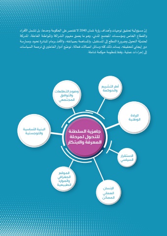 جاهزية السلطنةللتحول لمرحلةالمعرفة والابتكارالإرادة الوطنيةالاستقرار السياسيالإنسان العماني ّ الممكنالموقع الجغرافي والموارد الطبيعيةالبنية الأساسية واللوجستيةوضوح التطلعات والتوافق المجتمعيأطر التشريع والحوكمةُمان 2040 ال تقتصر على الحكومة وحدها، بل تشمل األفراد ّ مسؤولية تحقيق توجهات وأهداف رؤية عإنوالقطاع الخاص ومؤسسات املجتمع املدني، وهو ما يعمق مفهوم الشراكة واملواطنة الفاعلة، املدركة َّة التحول وضرورة التطلع إلى املستقبل، واملساهمة بصياغته، واألخذ بزمام املبادرة نحوه، وممارسة لحتميّ ح أدوار الفاعلين في ترجمة السياسات دور إيجابي لتحقيقه، يساند ذلك كله وسائل اتصاالت فعالة، توضإلى إجراءات عملية، وفقا ملنظومة حوكمة شاملة.