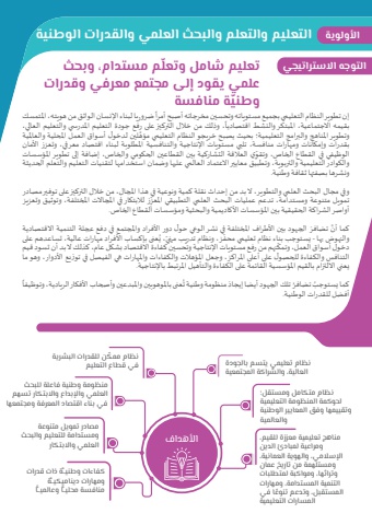 ً ضروريا لبناء اإلنسان الواثق من هويته، املتمسك إن تطوير النظام التعليمي بجميع مستوياته وتحسين مخرجاته أصبح أمراً، وذلك من خالل التركيز على رفع جودة التعليم املدر�سي والتعليم العالي، بقيمه االجتماعية، املبتكر والنشط اقتصادياَّ لين لدخول أسواق العمل املحلية والعاملية بقدرات وإمكانات ومهارات منافسة، تلبي مستويات اإلنتاجية والتنافسية املطلوبة لبناء اقتصاد معرفي، وتعزز األمان وتطوير املناهج والبرامج التعليمية؛ بحيث يصبح خريجو النظام التعليمي مؤهِي العالقة التشاركية بين القطاعين الحكومي والخاص، إضافة إلى تطوير املؤسسات ّالوظيفي في القطاع الخاص، وتقووالكوادر التعليمية والتربوية، وتطبيق معايير االعتماد العالمي عليها وضمان استخدامها لتقنيات التعليم والتعلم الحديثة ونشرها بصفتها ثقافة وطنية. وفي مجال البحث العلمي والتطوير، ال بد من إحداث نقلة كمية ونوعية في هذا املجال، من خالل التركيز على توفير مصادر ِز لالبتكار في املجاالت املختلفة، وتوثيق وتعزيز ّأواصر الشراكة الحقيقية بين املؤسسات األكاديمية والبحثية ومؤسسات القطاع الخاص. تمويل متنوعة ومستدامة، تدعم عمليات البحث العلمي التطبيقي املعزَ الجهود بين األطراف املختلفة في نشر الوعي حول دور األفراد واملجتمع في دفع عجلة التنمية االقتصادية َّ تضافركما أنُعنى بإكساب األفراد مهارات عالية، تساعدهم على ّ، يّ ز، ونظام تدريب منهيّ نهم من رفع مستويات اإلنتاجية وتحسين كفاءة االقتصاد بشكل عام، كذلك ال بد أن تسود قيم والنهوض بها - يستوجب بناء نظام تعليمي محفدخول أسواق العمل، وتمكالتنافس والكفاءة للحصول على أعلى املراكز، وجعل املؤهالت والكفاءات واملهارات هي الفيصل في توزيع األدوار، وهو ما يعني االلتزام بالقيم املؤسسية القائمة على الكفاءة والتأهيل املرتبط باإلنتاجية. ًُعنى باملوهوبين واملبدعين وأصحاب األفكار الريادية، وتوظيفاَ منظومة وطنية تُ تلك الجهود أيضا إيجادُ تضافركما يستوجبأفضل للقدرات الوطنية.التعليم والتعلم والبحث العلمي والقدرات الوطنيةّم مستدام، وبحث تعليم شامل وتعلعلمي يقود إلى مجتمع معرفي وقدرات ّ وطنية منافسةكفاءات وطنيــ�ة ذات قدرات ومهارات ديناميكيــ�ة منافسة محليــ�ا وعالميــ�انظام تعليمي يتسم بالجودة العالية، والشراكة المجتمعيةنظام ّ ممكن للقدرات البشرية في قطاع التعليممنظومة وطنية فاعلة للبحث العلمي والإبداع والابتكار تسهم في بناء اقتصاد المعرفة ومجتمعهانظام متكامل ومستقل؛ لحوكمة المنظومة التعليمية وتقييمها وفق المعايير الوطنية مصادر تمويل متنوعة والعالميةومستدامة للتعليم والبحث مناهج تعليمية معززة للقيم، العلمي والابتكارومراعية لمبادئ الدين الإسلامي، والهوية العمانية، ومستلهمة من تاريخ عمان وتراثها، ومواكبة لمتطلبات التنمية المستدامة، ومهارات ً المستقبل، وتدعم تنوعا في المسارات التعليميةالأهدافاألولويةالتوجه االستراتيجي