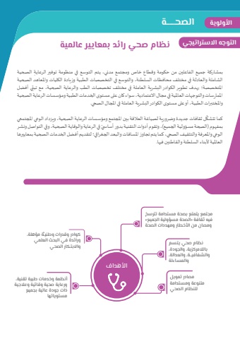 ِ بمشاركة جميع الفاعلين من حكومة وقطاع خاص ومجتمع مدني، يتم التوسع في منظومة توفير الرعاية الصحية الشاملة والعادلة في مختلف محافظات السلطنة، والتوسع في التخصصات الطبية وزيادة الكليات واملعاهد الصحية ِ ي أفضل ّاملتخصصة؛ بهدف تطوير الكوادر البشرية العاملة في مختلف تخصصات الطب والرعاية الصحية، مع تبناملمارسات والتوجهات العاملية في مجال االعتمادية، سواء كان على مستوى الخدمات الطبية ومؤسسات الرعاية الصحية واملختبرات الطبية، أو على مستوى الكوادر البشرية العاملة في املجال الصحي.َّل ثقافات جديدة وضرورية لصياغة العالقة بين املجتمع ومؤسسات الرعاية الصحية، ويزداد الوعي املجتمعي كما تتشكّ في الرعاية والوقاية الصحية، وفي التواصل ونشر بمفهوم )الصحة مسؤولية الجميع(، وتقوم أدوات التقنية بدور أسا�سيالوعي واملعرفة والتثقيف الصحي، كما يتم تجاوز املسافات والبعد الجغرافي؛ لتقديم أفضل الخدمات الصحية بمعاييرها العاملية ألبناء السلطنة والقاطنين فيها.الصحــــــةنظام صحي رائد بمعايير عالميةمجتمع يتمتع بصحة مستدامة تترسخ فيه ثقافة «الصحة مسؤولية الجميع» ومصان من الأخطار ومهددات الصحةكوادر وقدرات وطنيـ�ة مؤهلة، ورائدة في البحث العلمي نظام صحي يتسم والابتكار الصحيباللامركزية، والجودة، والشفافيــة، والعدالة، والمساءلةأنظمة وخدمات طبية تقنية، ورعاية صحية وقائية وعلاجية ذات جودة عالية بجميع مستوياتهامصادر تمويل متنوعة ومستدامة للنظام الصحيالأهدافاألولويةالتوجه االستراتيجي