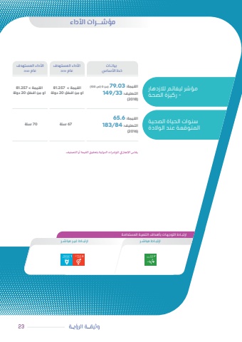 وثيقـــة الرؤيــة الأوليـــة 2 1مؤشــــرات الأداءارتبــاط التوجهـات بأهـداف التنميـة المستدامـةارتبــاط مباشــر ارتبــاط غيــر مباشــرالأداء المستهدفعام 2030الأداء المستهدفعام 2040بيانــاتخط الأساس23مؤشر ليغاتم لالزدهار - ركيزة الصحة سنوات الحياة الصحية المتوقعة عند الوالدةالقيمة: 03.79( من 0 إلى 100)التصنيف: 33/149)2018 )القيمة: 6.65التصنيف: 84/183)2016 )القيمة < 257.81أو من أفضل 20 دولة67 سنةالقيمة < 257.81أو من أفضل 20 دولة70 سنةيقاس اإلنجاز في املؤشرات الدولية بتحقيق القيمة أو التصنيف