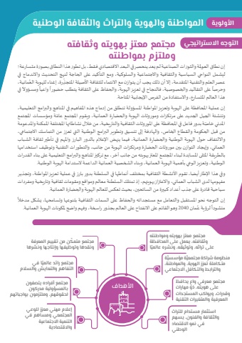 إن نطاق العوملة والثورات الصناعية لم يعد ينحصر في البعد االقتصادي فقط، بل تطور هذا النطاق بصورة متسارعة؛ ليشمل النواحي السياسية والثقافية واالجتماعية والسلوكية، ومع التأكيد على الحاجة لنهج التحديث واالندماج في ُمانية، ِ رة، إغناء للهوية العّعصر العلم والتقنية املتقدمة، إال أن ذلك يجب أن يتوازن مع االنتماء للثقافة األصيلة املتجذً في ً ومسؤوالً واعياً على التقاليد والخصوصية، فالنجاح في تعزيز الهوية، والحفاظ على الثقافة يتطلب حضوراوحرصاهذا العالم املتسارع، واالستفادة من الفرص اإليجابية املتاحة.إن عملية املحافظة على الهوية وتعزيز املواطنة املسؤولة تنطلق من إدماج هذه املفاهيم في املناهج والبرامج التعليمية، ّة ومؤسسات املجتمع وتنشئة الجيل الجديد على مرتكزات وموروثات الهوية والحضارة العمانية، ويقوم املجتمع عامّة بدور فاعل في املحافظة على املوروثات الثقافية والتاريخية، من خالل نشاطاتها املختلفة املمكنة واملدعومة املدني خاصمن قبل الحكومة والقطاع الخاص، والهادفة إلى تنسيق وتطوير البرامج الوطنية التي تعزز من التماسك االجتماعي، وااللتفاف حول الهوية الوطنية والحضارة العمانية، فيما ينهض اإلعالم بالدور البارز واملهم في تأطير ثقافة الشباب العماني، وإيجاد التوازن بين موروثات الحضارة ومرتكزات الهوية من جانب، والتطورات التقنية وتوظيف استخدامها ِدة لبناء املجتمع املعتز بهويته من جانب آخر، مع تركيز املناهج والبرامج التعليمية على بناء القدرات بالطريقة املثلى املسانالوطنية، وتعزيز الوعي بأهمية الهوية العمانية، وبناء الشخصية العمانية الداعمة الستدامة الهوية الوطنية.وفي هذا اإلطار أيضا، تقوم األنشطة الثقافية بمختلف أنماطها في السلطنة بدور بارز في عملية تعزيز املواطنة، وتجذير مفهومها لدى الشباب العماني، واالعتزاز بهويتهم، إذ تمتلك السلطنة معالم ومواقع ومقومات ثقافية وتاريخية ومفردات سياحية قادرة على جذب أعداد كبيرة من السائحين، بحيث تعكس للعالم الهوية والحضارة العمانية. ًإن التوجه نحو املستقبل والتعامل مع مستجداته والحفاظ على السمات الثقافية بتنوعها وتسامحها، يشكل مدخالُمان 2040 وهو القائم على االنفتاح على العالم بجذورراسخة، وفهم واضح ملكونات الهوية العمانية.ً لرؤية عمنشوداالمواطنة والهوية والتراث والثقافة الوطنيةمجتمع معتز بهويته وثقافته وملتزم بمواطنتهمجتمع معتز بهويته ومواطنتهوثقافته، يعمل على المحافظةّ على تراثه، وتوثيقه، ونشره عالميامجتمع ّ متمكن من تقييم المعرفةونقدها وتوظيفها وإنتاجها ونشرها� منظومة شراكة مجتمعي � ة مؤسسيةمتكاملة تعزز الهوية، والمواطنة،والترابط والتكافل الاجتماعيّ مجتمع رائد عالميا فيالتفاهم والتعايش والسلامعلى هويته، ذو مهارات ٍ مجتمع معرفي واع يحافظوقدرات، ويواكب المستجداتالمعرفية والمتغيرات التقنيةمجتمع أفراده يتصفونبالمسؤولية مدركونلحقوقهم، وملتزمون بواجباتهماستثمار مستدام للتراثوالثقافة والفنون، يسهمفي نمو الاقتصادالوطنيإعلام مهني معزز للوعيالمجتمعي ومساهم فيالتنمية الاجتماعيةوالاقتصاديةالأهدافاألولويةالتوجه االستراتيجي