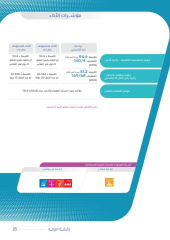 وثيقـــة الرؤيــة الأوليـــة 2 1مؤشــــرات الأداءارتبــاط التوجهـات بأهـداف التنميـة المستدامـةارتبــاط مباشــر ارتبــاط غيــر مباشــربيانــاتخط الأساسالأداء المستهدفعام 2030الأداء المستهدفعام 204025مؤشر التنافسية العالمية - ركيزة األمنمؤشر ليغاتم لالزدهار -ركيزة رأس المال االجتماعيمؤشر الثقافة والقيمالقيمة: 6.94( من 0 إلى 100)التصنيف: 4/140)2018 )القيمة < 6.94أو البقاء ضمن أفضل 5 دول في العالمالقيمة < 6.94أو البقاء ضمن أفضل 5 دول في العالمالقيمة < 905.63أو من أفضل 10 دولالقيمة < 062.60أو من أفضل 20 دولةالقيمة: 2.51( من 0 إلى 100)التصنيف: 68/149)2018 )ًمؤشر جديد سيتم تطويره وتحديد مستهدفاته الحقايقاس اإلنجاز في املؤشرات الدولية بتحقيق القيمة أو التصنيف